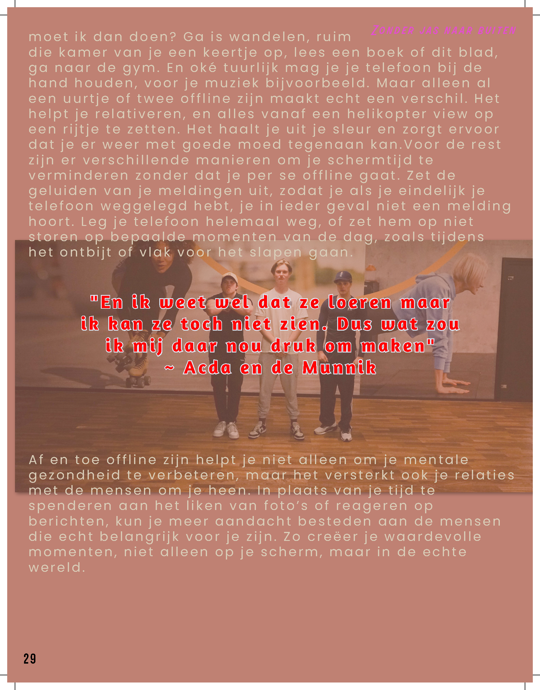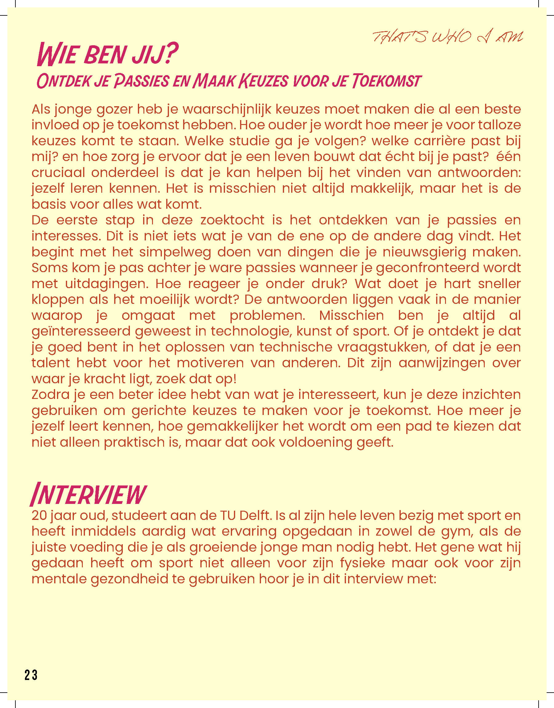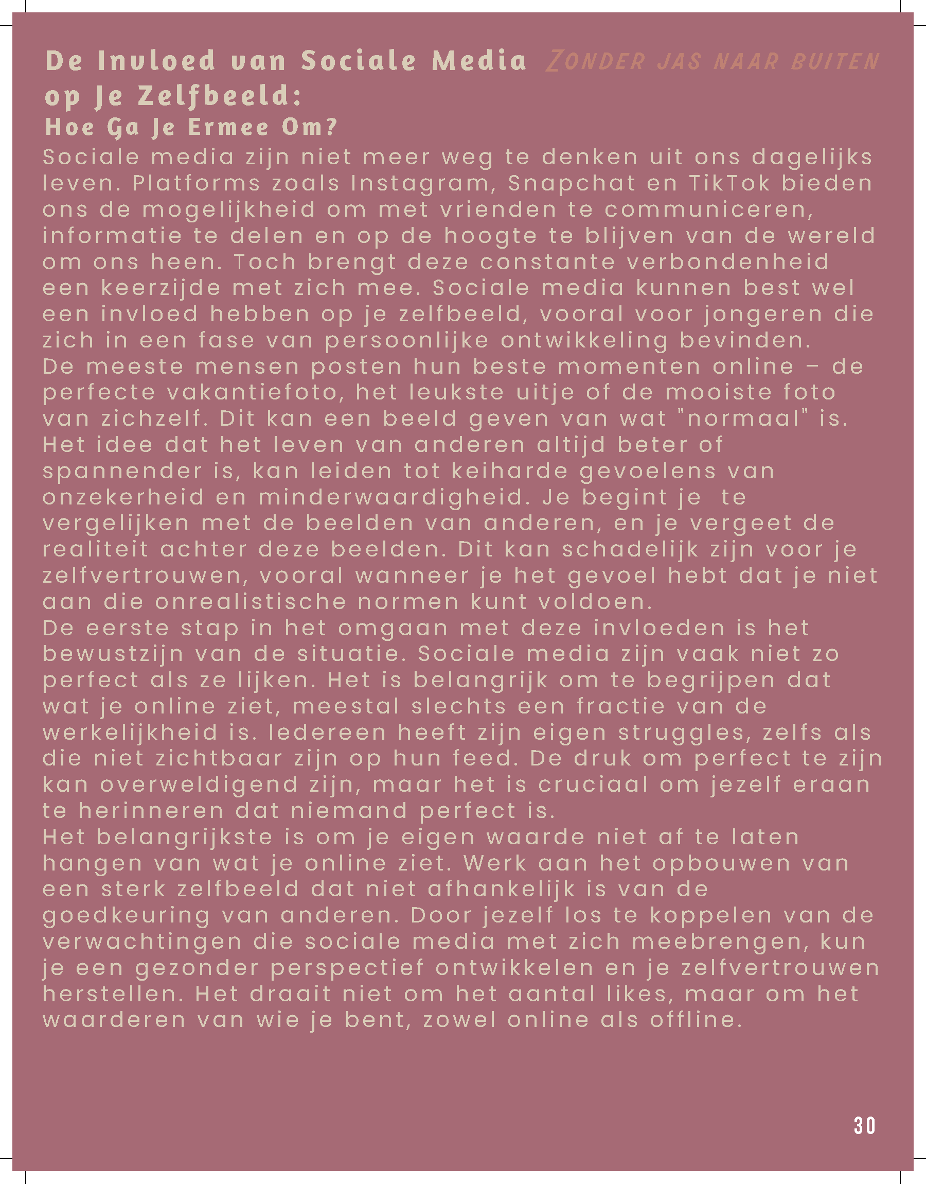 De rubrieken in het magazine zijn zo opgebouwd dat ze de verschillende facetten van de jongerenervaring met elkaar verbinden. ‘That’s Who I Am’ gericht op Identiteit en Zelfontdekking biedt jongeren handvatten om te reflecteren op hun eigen identiteit. Het magazine biedt inzicht in hoe ze hun zelfvertrouwen kunnen versterken, wat hen kan helpen om hun eigen pad te vinden in de wereld, of het nu gaat om keuzes voor studie of carrière, of het ontwikkelen van relaties. Elk artikel is gericht op het bevorderen van een gezonde mentale toestand, waarbij jongeren niet alleen geïnformeerd worden, maar ook gestimuleerd om na te denken over hun eigen ontwikkeling. ‘Zonder Jas Naar Buiten’ gericht op sociale relaties en sociale media gaat verder in op de impact van vriendschappen, romantische relaties en de rol van technologie in het leven van jonge mensen. Hier worden thema’s behandeld zoals online interacties, de zoektocht naar verbondenheid en de invloed van sociale media op zelfbeeld en communicatie. Het magazine biedt niet alleen praktische tips, maar ook reflectieve vragen die jongeren aanmoedigen om bewuster om te gaan met de keuzes die ze maken in hun sociale leven. Zo wordt het een veelzijdig instrument dat zowel praktisch als inspirerend werkt voor een generatie die zich bevindt in een periode van grote persoonlijke en sociale verandering. Deze rubrieken zijn allebei 6 pagina’s van het magazine.