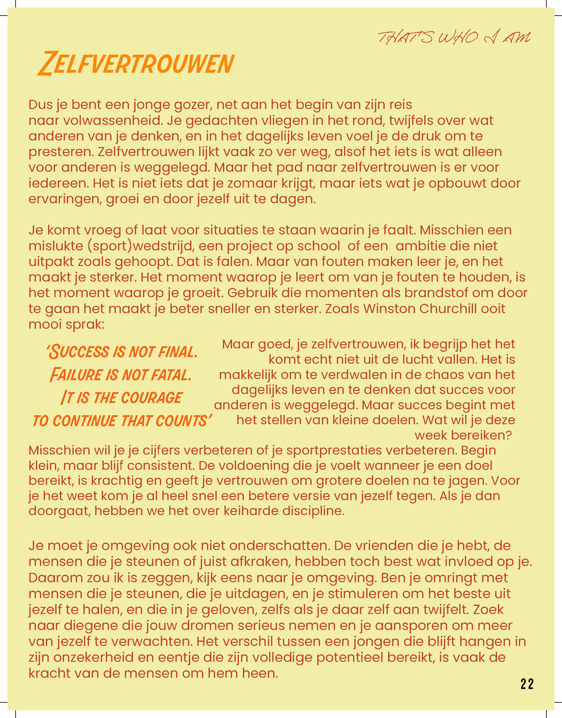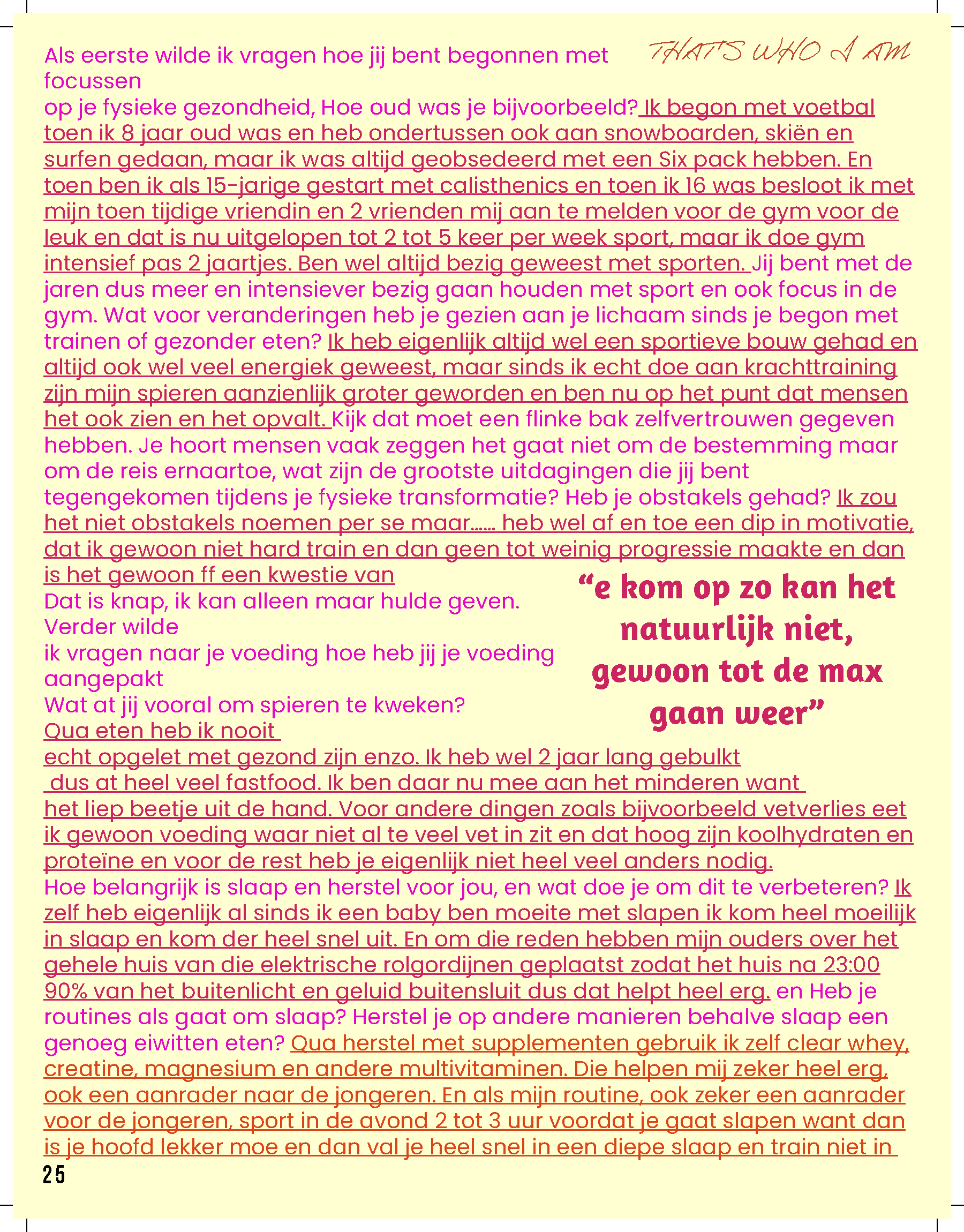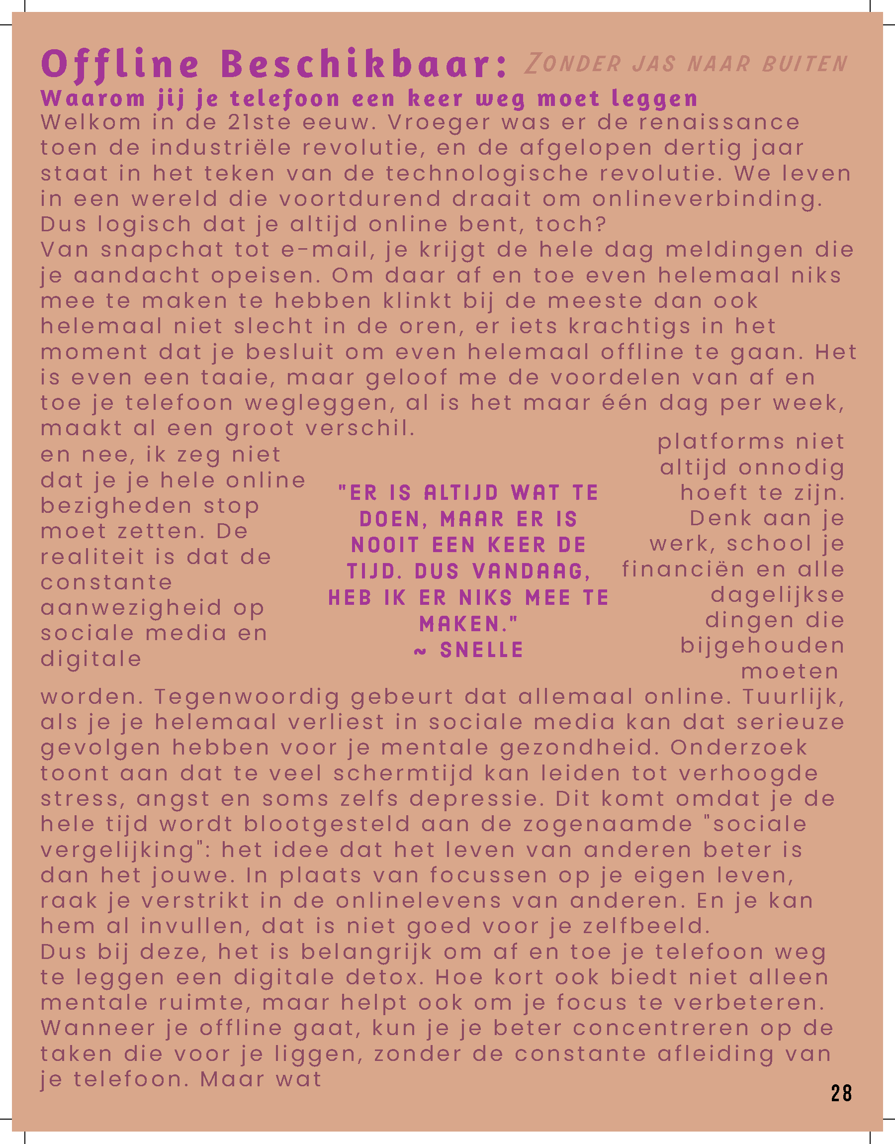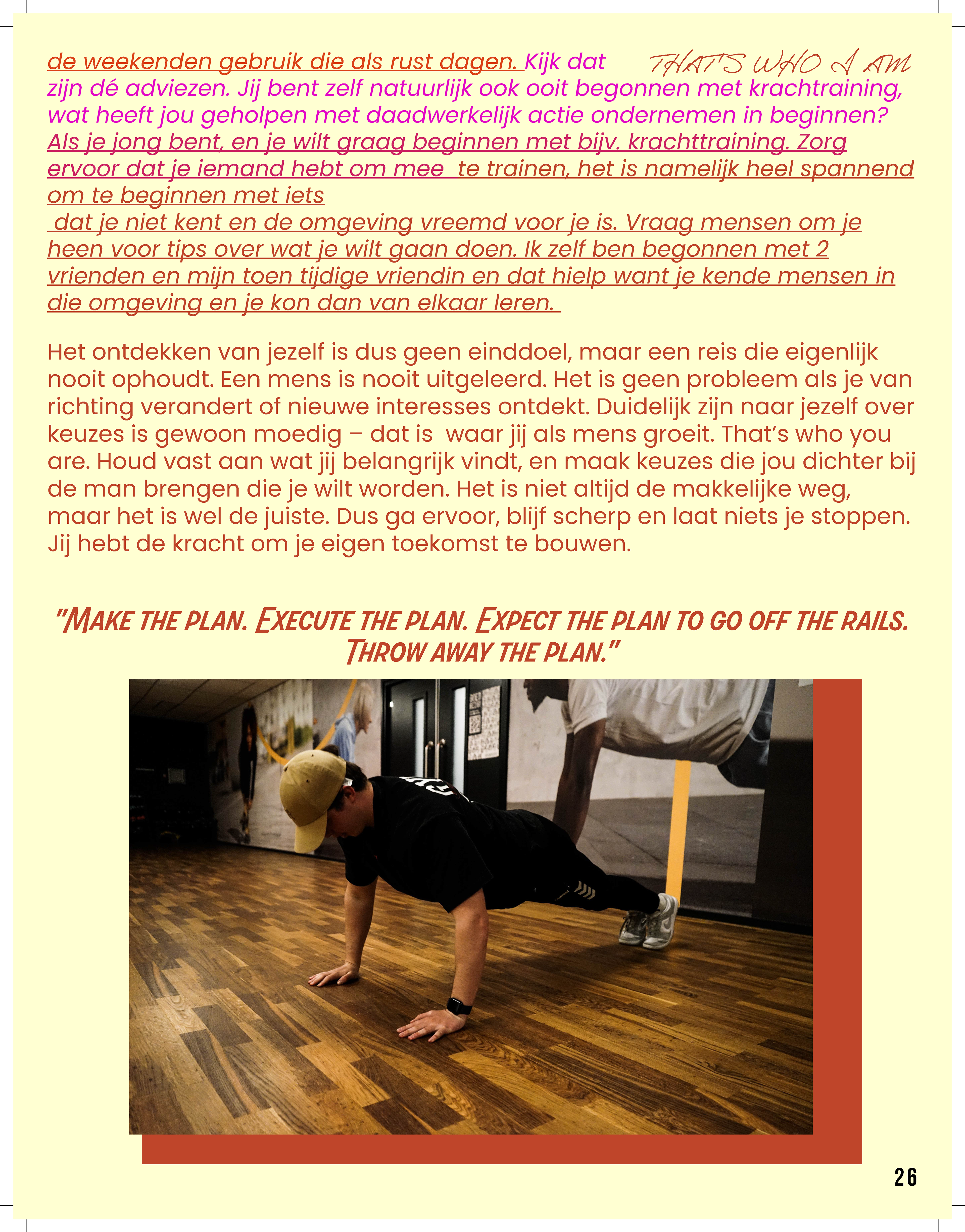 De rubrieken in het magazine zijn zo opgebouwd dat ze de verschillende facetten van de jongerenervaring met elkaar verbinden. ‘That’s Who I Am’ gericht op Identiteit en Zelfontdekking biedt jongeren handvatten om te reflecteren op hun eigen identiteit. Het magazine biedt inzicht in hoe ze hun zelfvertrouwen kunnen versterken, wat hen kan helpen om hun eigen pad te vinden in de wereld, of het nu gaat om keuzes voor studie of carrière, of het ontwikkelen van relaties. Elk artikel is gericht op het bevorderen van een gezonde mentale toestand, waarbij jongeren niet alleen geïnformeerd worden, maar ook gestimuleerd om na te denken over hun eigen ontwikkeling. ‘Zonder Jas Naar Buiten’ gericht op sociale relaties en sociale media gaat verder in op de impact van vriendschappen, romantische relaties en de rol van technologie in het leven van jonge mensen. Hier worden thema’s behandeld zoals online interacties, de zoektocht naar verbondenheid en de invloed van sociale media op zelfbeeld en communicatie. Het magazine biedt niet alleen praktische tips, maar ook reflectieve vragen die jongeren aanmoedigen om bewuster om te gaan met de keuzes die ze maken in hun sociale leven. Zo wordt het een veelzijdig instrument dat zowel praktisch als inspirerend werkt voor een generatie die zich bevindt in een periode van grote persoonlijke en sociale verandering. Deze rubrieken zijn allebei 6 pagina’s van het magazine.