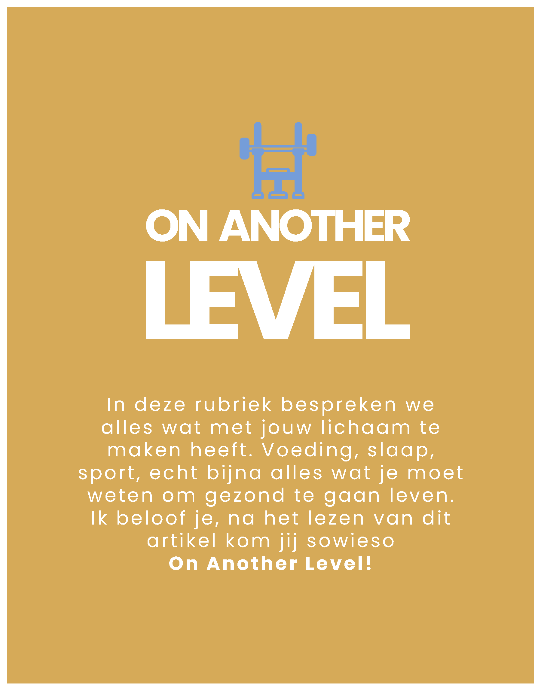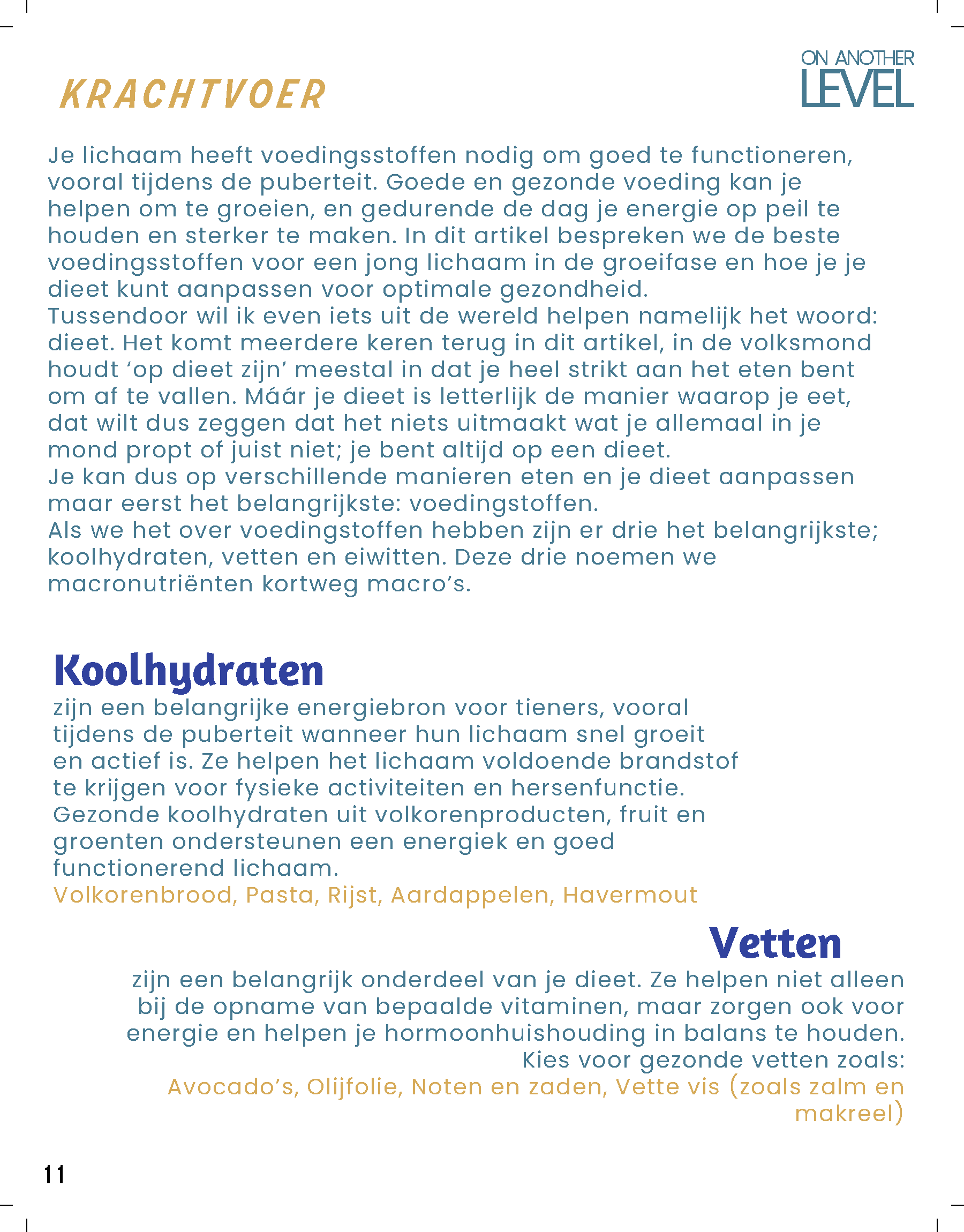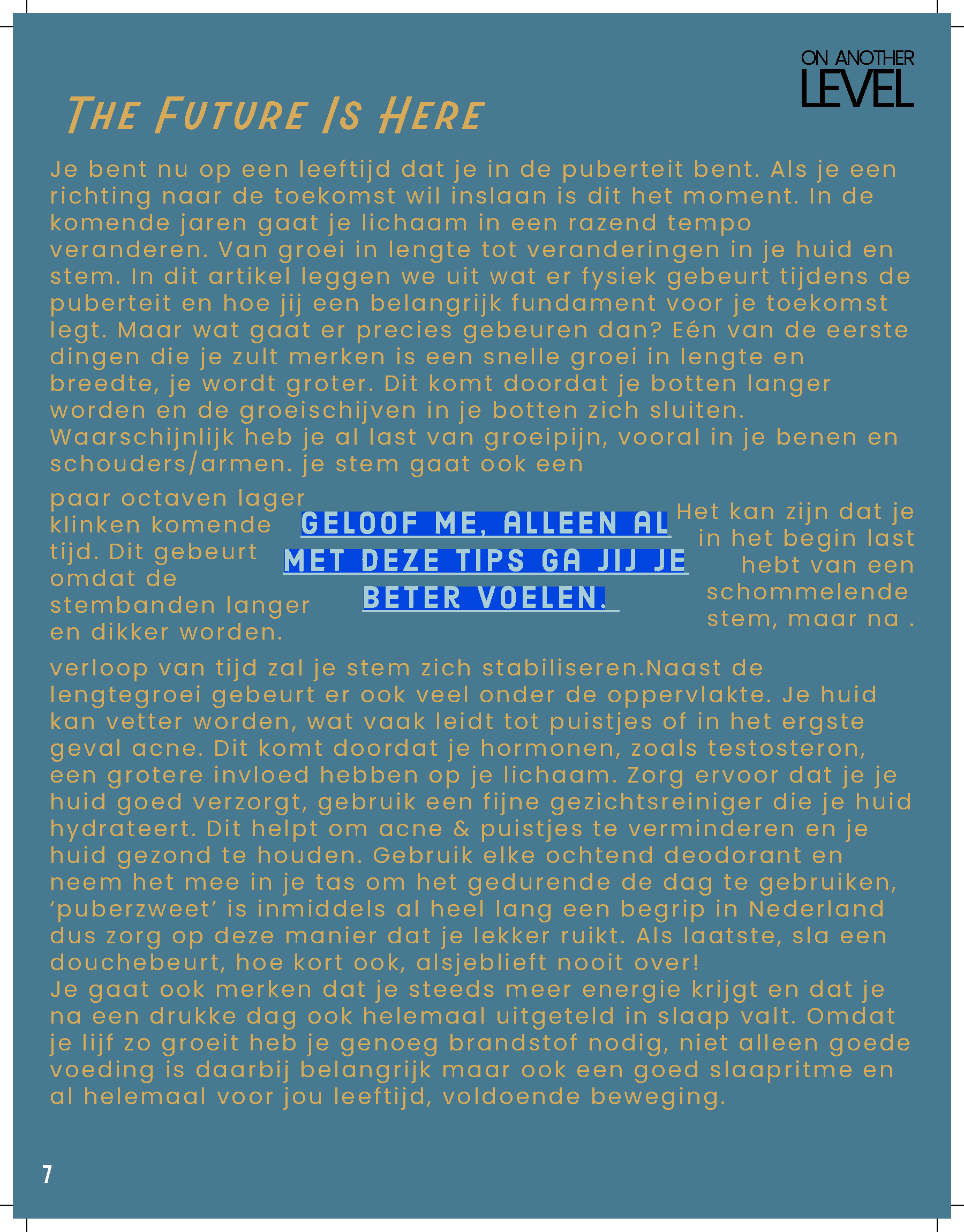 Het magazine is opgebouwd uit drie hoofdthema’s, die elk de ervaringen in hun levensfase weerspiegelen. Te beginnen met; ‘On Another Level’ gericht op de fysieke groei en gezondheid, Deze rubriek word de grootste van het tijdschrift, met 7 pagina’s vol praktische tips over sport, voeding, slaap en algemene gezondheid. Deze rubriek zal niet alleen aandacht besteden aan de lichamelijke veranderingen die jongeren doormaken, maar ook aan leerzame informatie over hoe ze hun fysieke gezondheid optimaal kunnen ondersteunen.