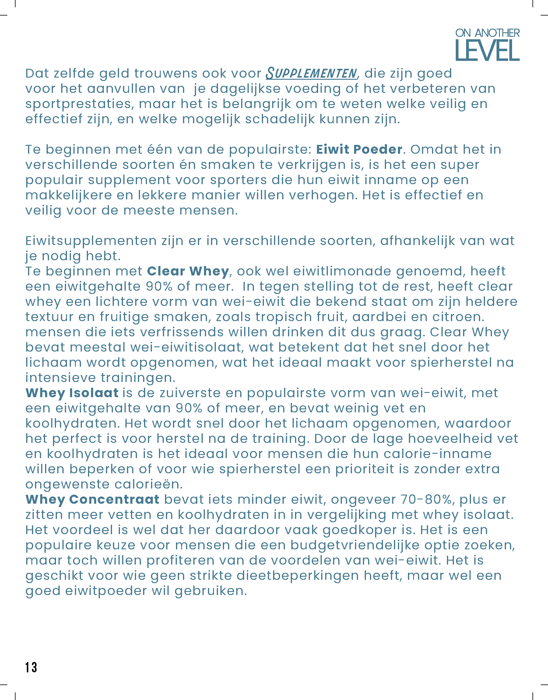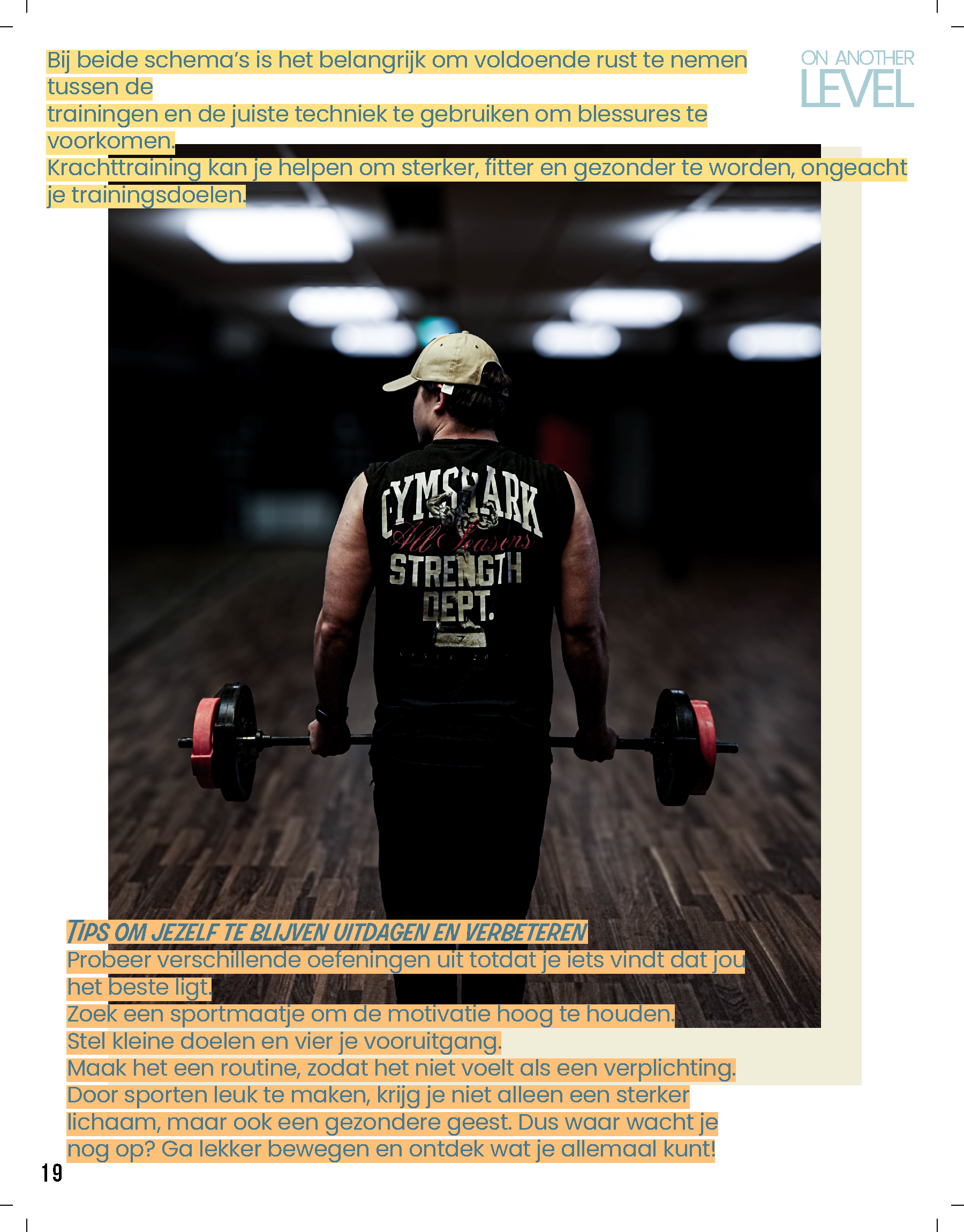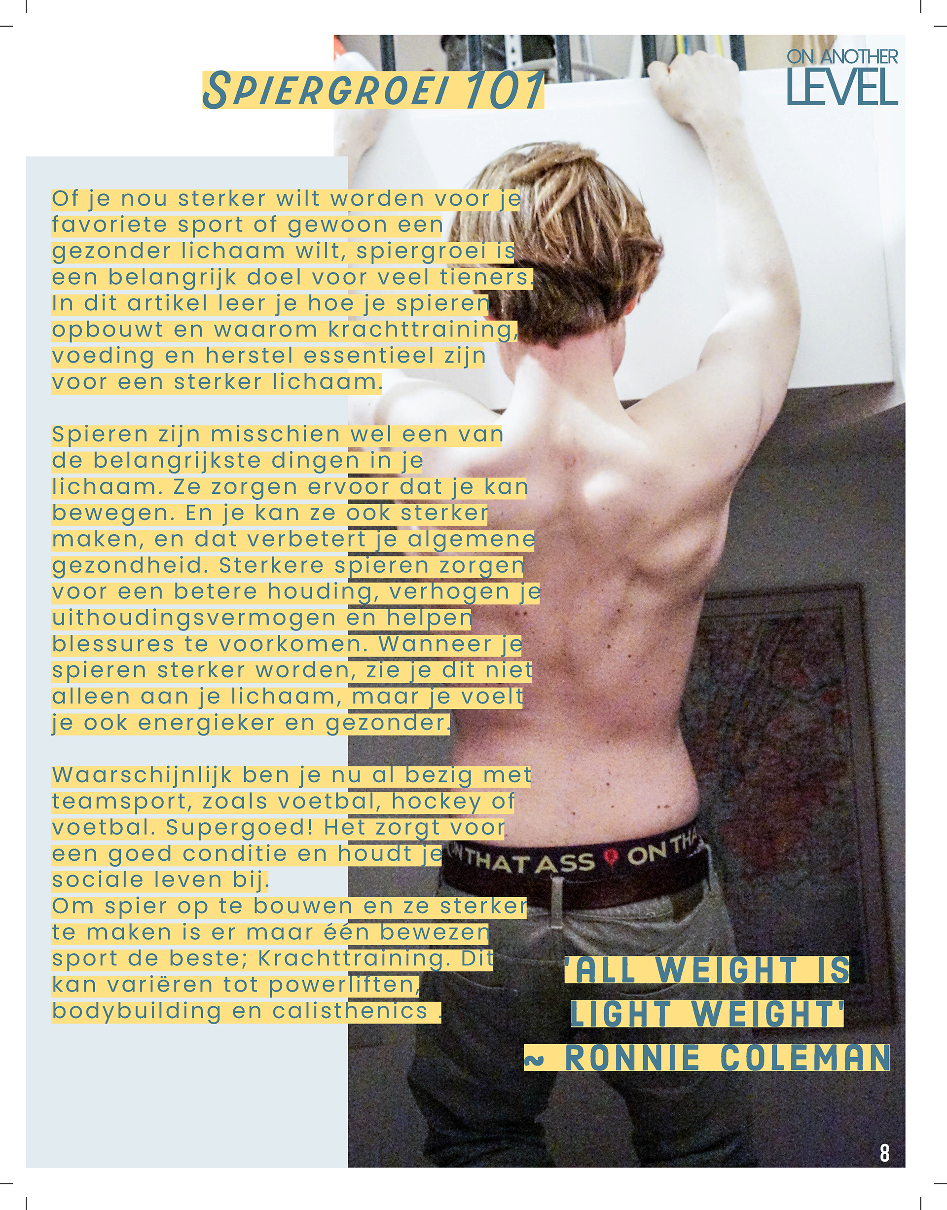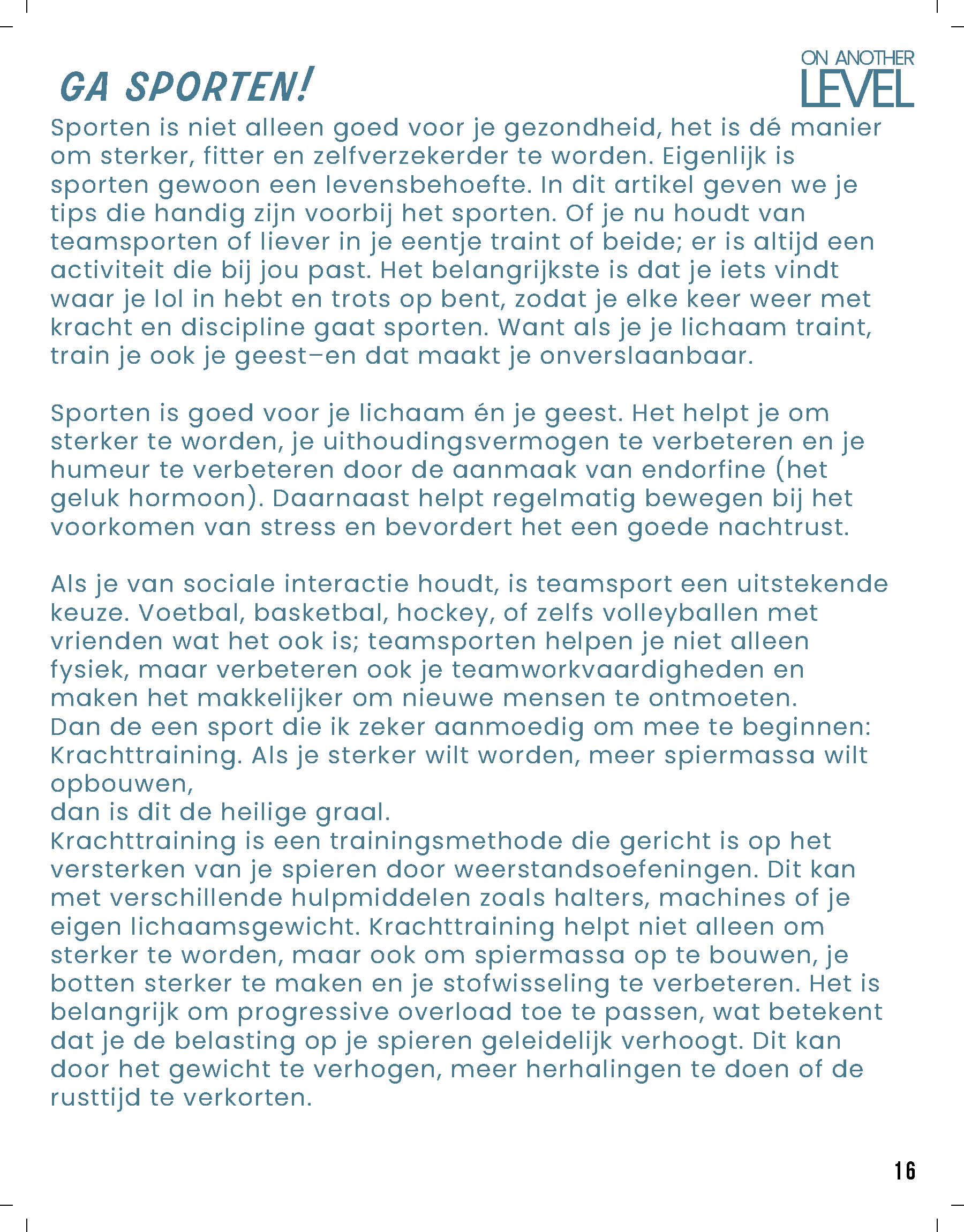 Het magazine is opgebouwd uit drie hoofdthema’s, die elk de ervaringen in hun levensfase weerspiegelen. Te beginnen met; ‘On Another Level’ gericht op de fysieke groei en gezondheid, Deze rubriek word de grootste van het tijdschrift, met 7 pagina’s vol praktische tips over sport, voeding, slaap en algemene gezondheid. Deze rubriek zal niet alleen aandacht besteden aan de lichamelijke veranderingen die jongeren doormaken, maar ook aan leerzame informatie over hoe ze hun fysieke gezondheid optimaal kunnen ondersteunen.