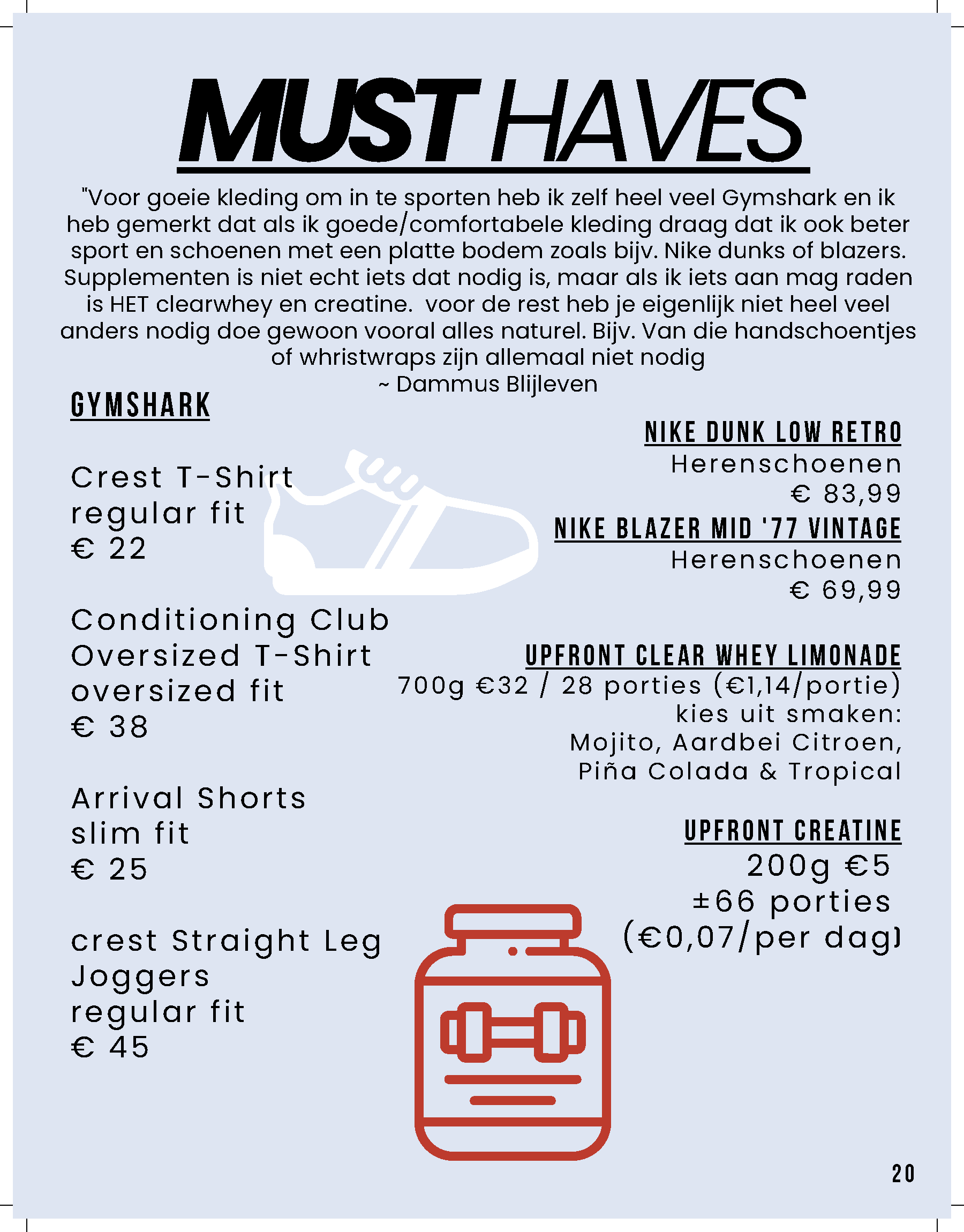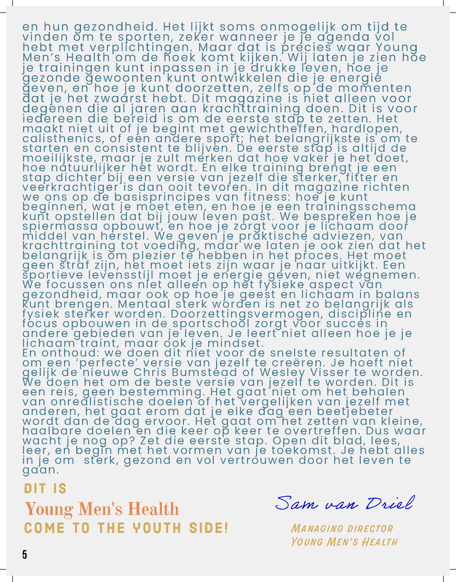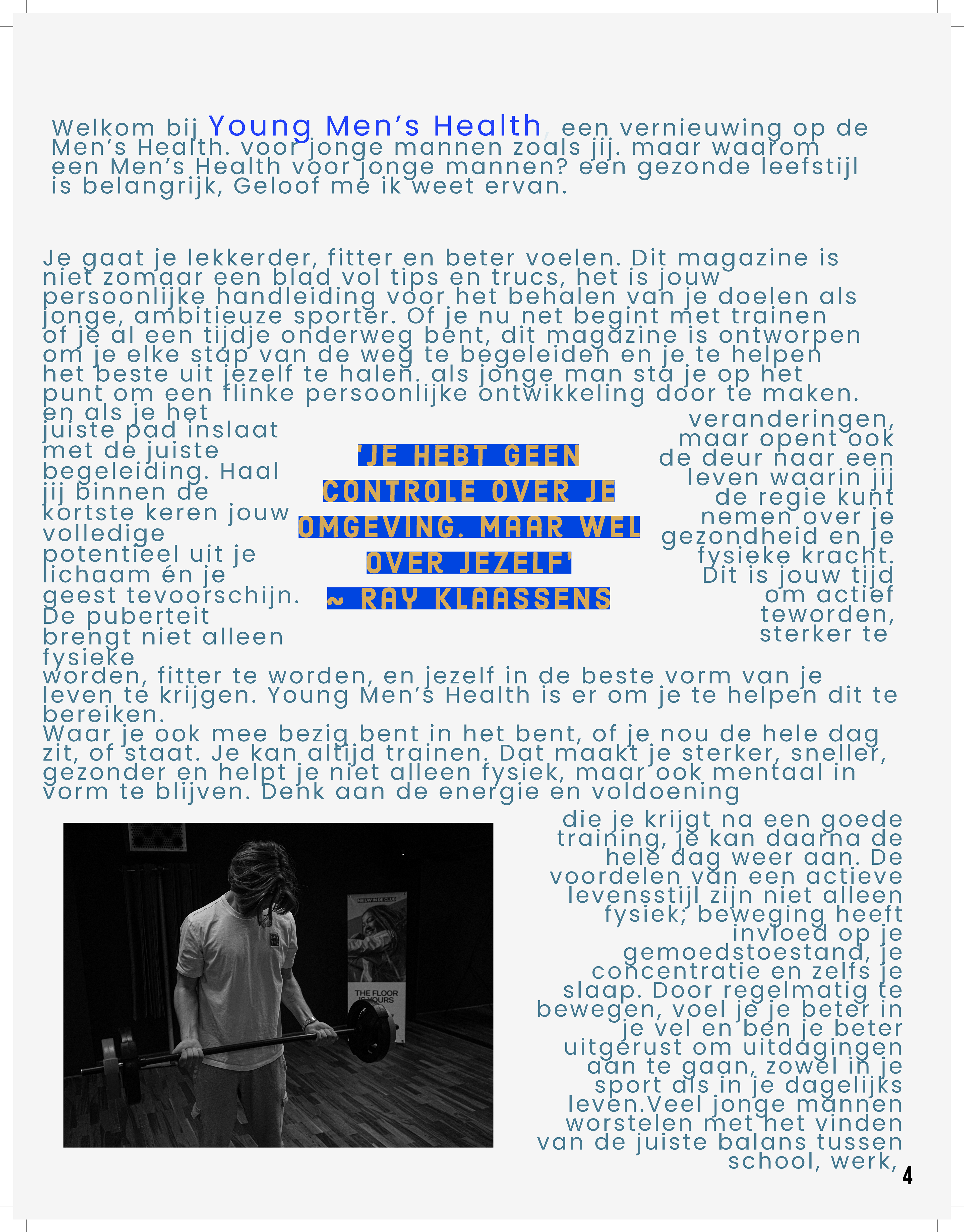 Het eindproduct van mijn idee: ‘Young Men’s Health’ moet een laagdrempelige toegankelijke gids met content die makkelijk te begrijpen is, maar ook voldoende diepgang biedt om de nieuwsgierigheid van jongeren te prikkelen. Worden die jonge mannen in mijn doelgroep meeneemt op een heuse ontdekkingsreis door hun fysieke, mentale en sociale ontwikkeling. In de opening van het magazine neemt de maker de lezer mee in een persoonlijke editorial, waarin hij ervaringen en inzichten deelt en de reden waarom hij dit magazine wilde maken. De maker deelt een boodschap van inspiratie en moedigt jongeren aan om hun unieke reis van persoonlijke groei te maken. De editorial zal de toon zetten voor het magazine en een uitnodigende sfeer introduceren waarmee het hele magazine meteen een gevoel van verbinding en motivatie creëert hieraan zullen 3 pagina’s besteed worden. Tussen de rubrieken door zijn drie pagina’s die specifiek gericht op artikelen die echte must-haves zijn en kunnen helpen bij een gezonde levensstijl.